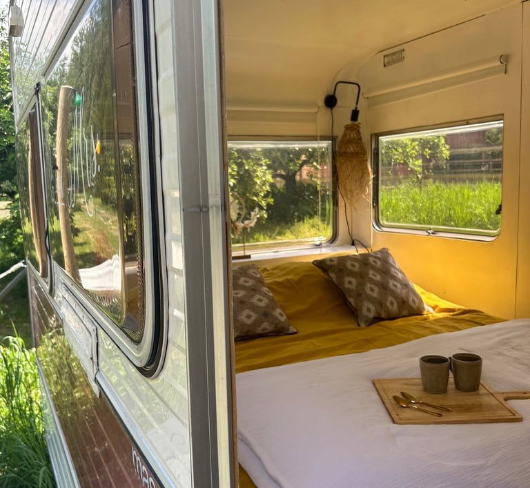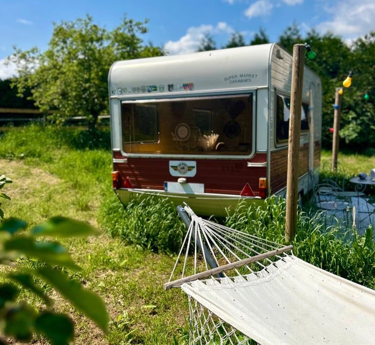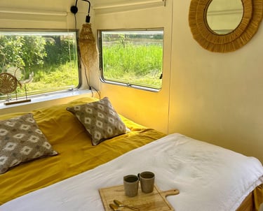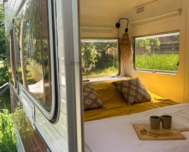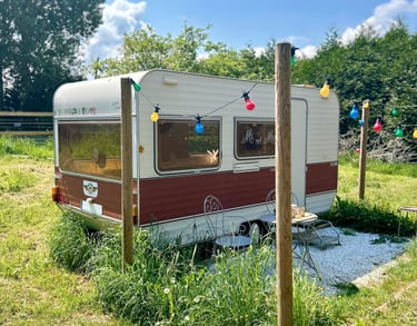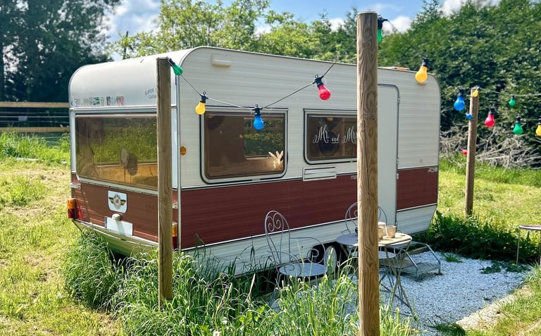 Installez-vous dans notre caravane nichée au cœur de la verdure.