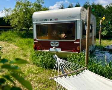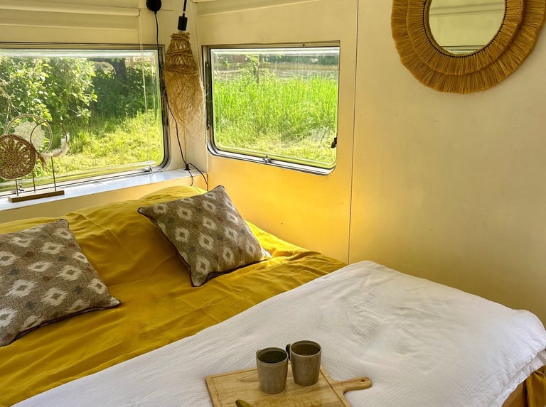 Installée en pleine nature, la caravane Bohème est l’endroit idéal pour faire une pause. Vue dégagée sur les champs, chevaux à proximité, calme garanti.